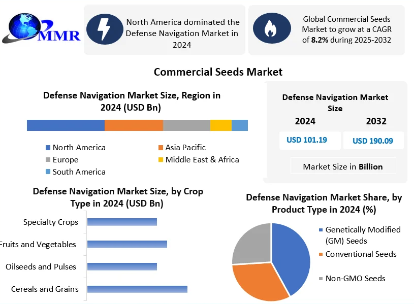 The Commercial Seeds Market was valued at approximately USD 101.19 billion in 2024 and is projected to reach USD 190.09 billion by 2032, growing at a compound annual growth rate (CAGR) of 8.2%. Commercial seeds encompass high-performance varieties, including genetically modified (GM), conventional, and non-GMO seeds, engineered to enhance crop yield, disease resistance, and climate adaptability. These seeds are pivotal in ensuring food security amid rising global population demands.