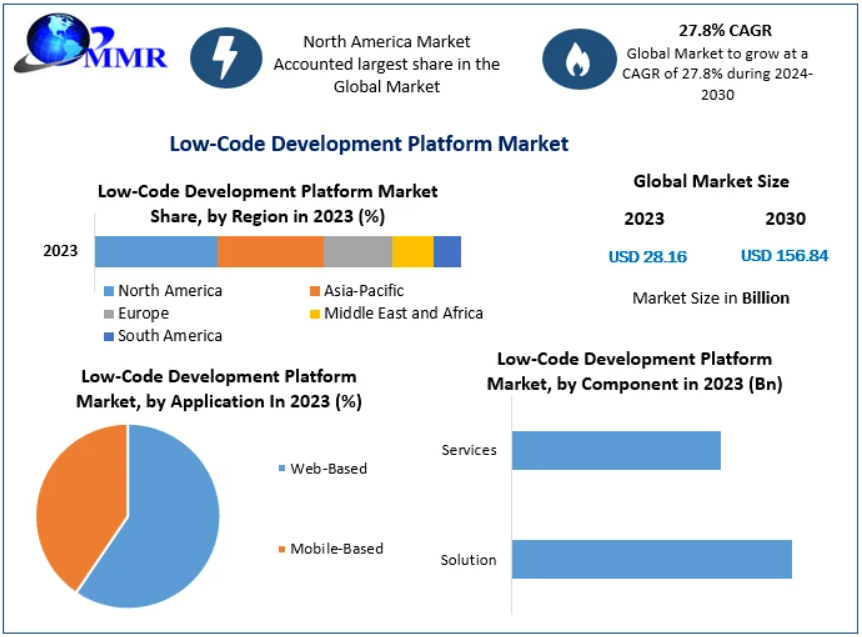 A thorough analysis of the "Low-Code Development Platform Market" has been provided by the research company Maximize Market Research. The research includes the competition landscape, pricing analysis, demand analysis, and critical business insights. The market size was valued at USD 28.16 Bn. in 2023 and the total Low-Code Development Platform revenue is expected to grow at 27.8% from 2024 to 2030, reaching nearly USD 156.84 Bn.