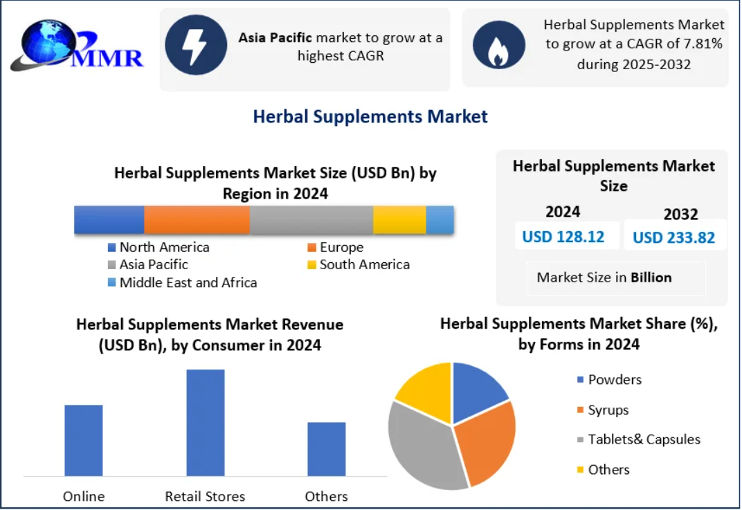 The Global Herbal Supplements Market was valued at USD 128.12 billion in 2024 and is poised for robust growth, projected to reach nearly USD 233.82 billion by 2032, at a CAGR of 7.81%. Driven by the rising consumer shift toward natural remedies, preventive healthcare, and plant-based nutrition, herbal supplements are increasingly becoming a staple in wellness routines worldwide.