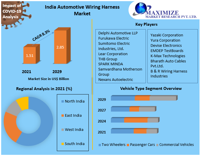 The India Automotive Wiring Harness Market has witnessed significant growth over the past decade and is projected to reach US$ 2.85 billion by 2029, growing at a robust CAGR of 8.3% from 2021. This growth is fueled by the increasing adoption of advanced automotive technologies, government initiatives, and the rapid expansion of India’s automobile industry.