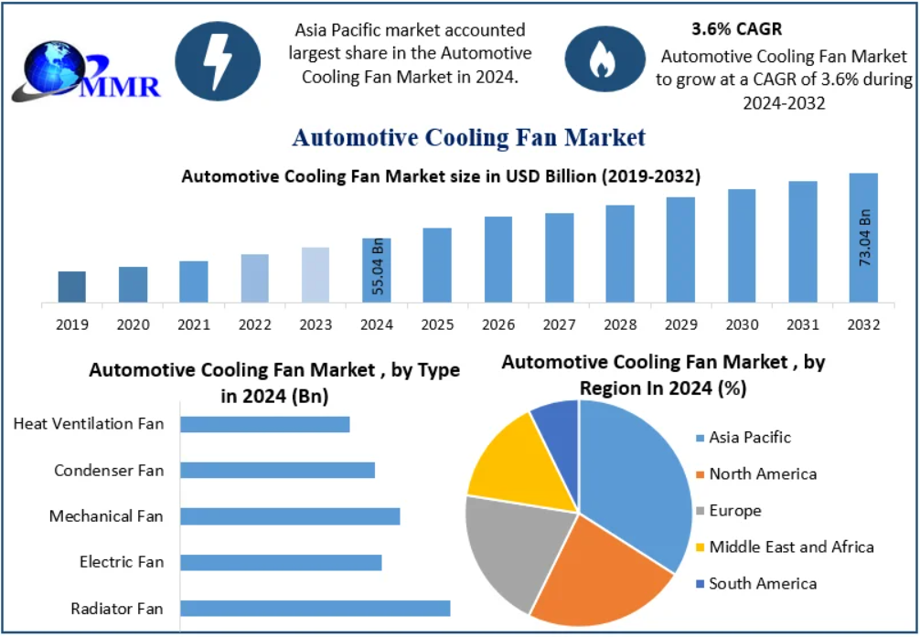 The Global Automotive Cooling Fan Market was valued at USD 55.04 billion in 2024 and is projected to grow at a CAGR of 3.6% from 2025 to 2032, reaching nearly USD 73.04 billion by the end of the forecast period. Automotive cooling fans are integral components of vehicle cooling systems, maintaining optimal engine temperatures and ensuring engine performance and longevity.
