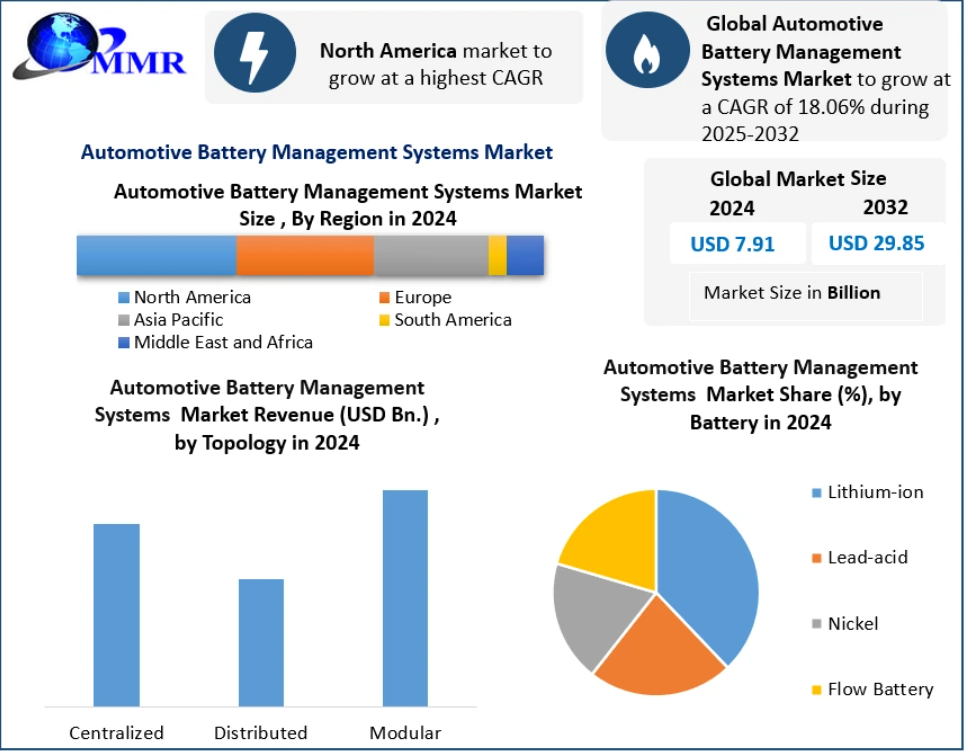 The Global Automotive Battery Management Systems (BMS) Market was valued at USD 7.91 billion in 2024 and is projected to grow at a CAGR of 18.06% from 2024 to 2032, reaching nearly USD 29.85 billion. This growth is being driven by the rapid adoption of electric vehicles (EVs), government initiatives promoting sustainable mobility, and advancements in battery management technologies.