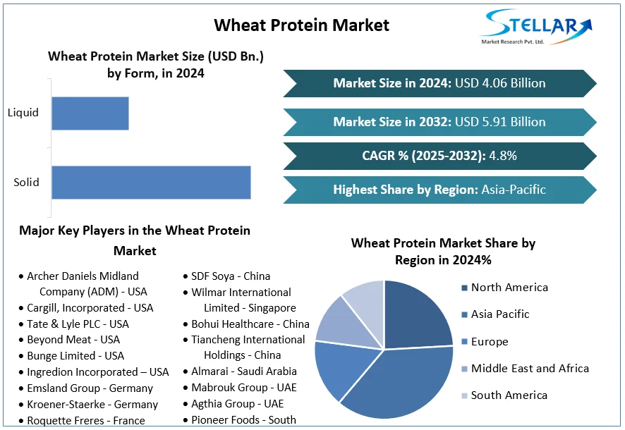 The global Wheat Protein Market, as per Stellar Market Research, was valued at USD 4.06 billion in 2024 and is expected to grow to USD 5.91 billion by 2032, representing a compound annual growth rate (CAGR) of 4.8 % during the forecast period.